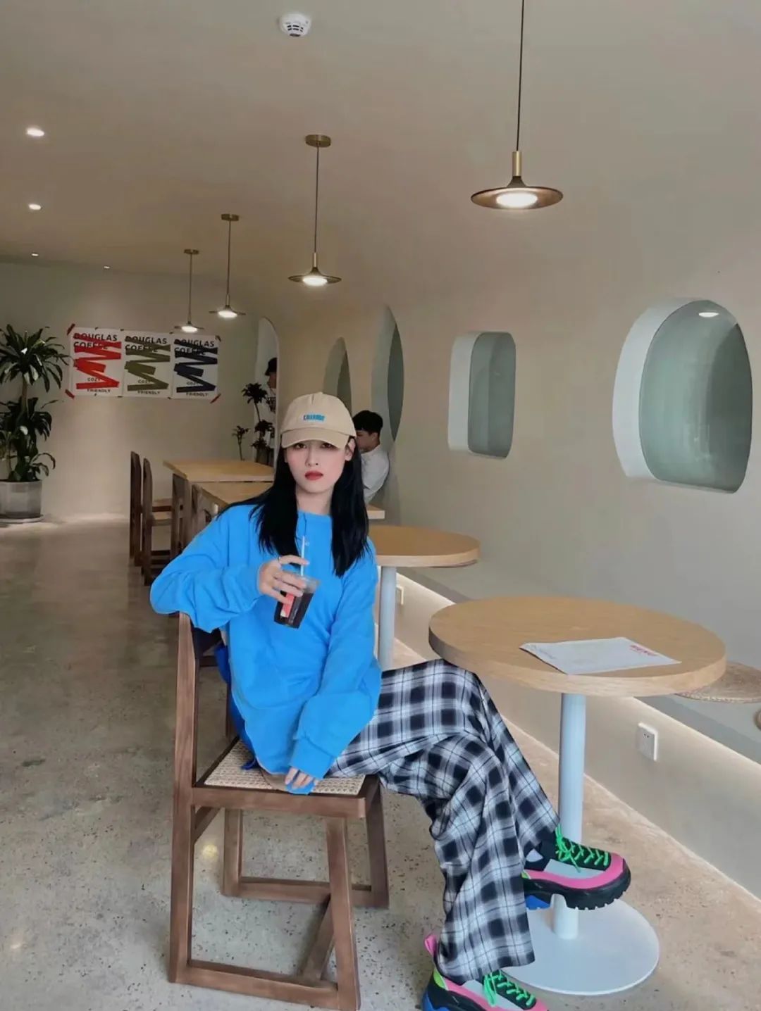 下裝則可以穿衛褲,格紋褲+運動鞋,很符合秋天慵懶休閒的氣氛感。