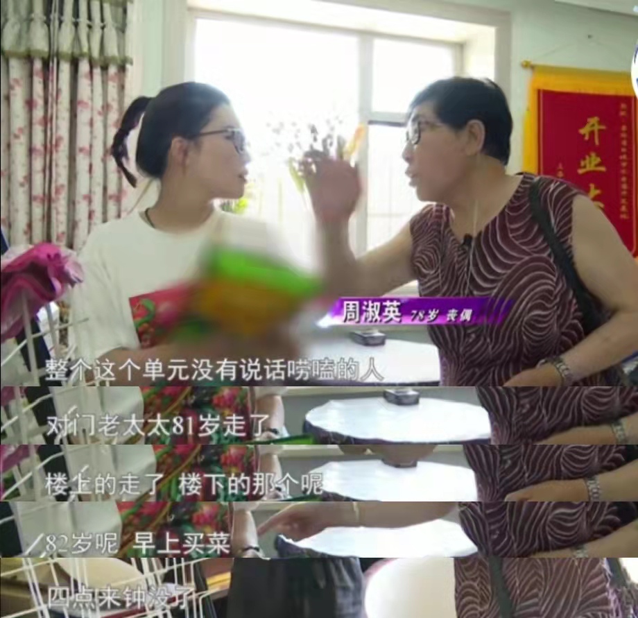 在她現在生活的那棟樓,對門81歲的老太太太走了,樓上的老人也去世了,樓下82歲的老人前不久也撒手人寰了。