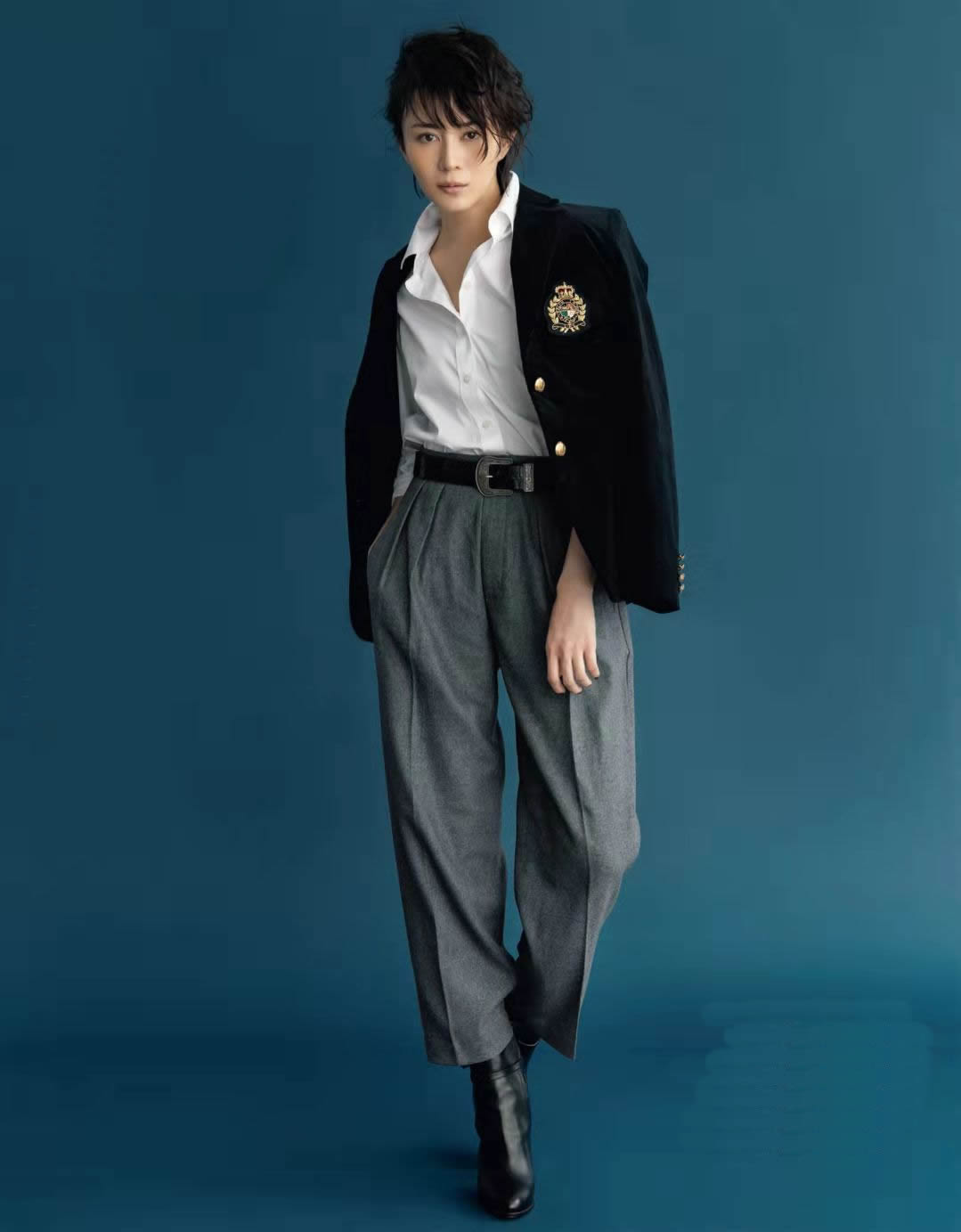 一件黑色海軍風西裝,華麗麗的勛章與大銅紐扣是明晃晃的時髦招牌。內搭簡潔白襯衫,下配灰色九分褲短靴,所有的利落帥氣全在此刻爆發。
