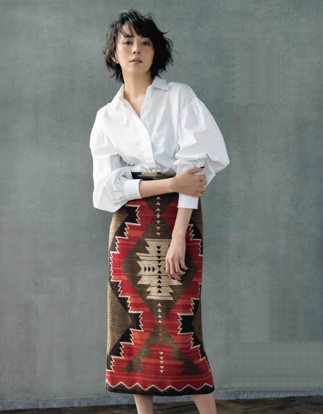 穿半身包臀裙時,也不會極致突出臀部的存在感。而是以灑落的H形表達工作氣場的利落與超強工作能力,再調和以寬鬆白襯衫,當下流行的廓形混搭自然擁有。