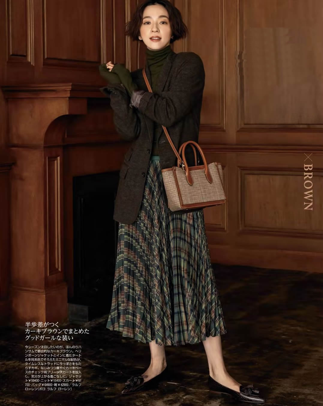 棕色西裝與印花百褶裙的風情共舞,腳踝露膚才是大戲哦。這套搭配非常適合膚白、骨架小的優雅女子,一穿就成經典。