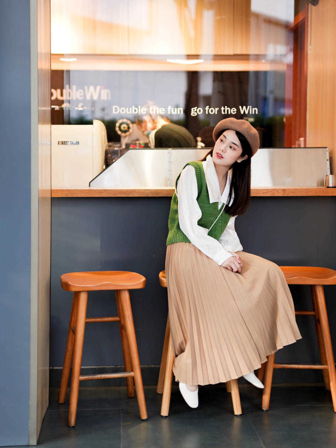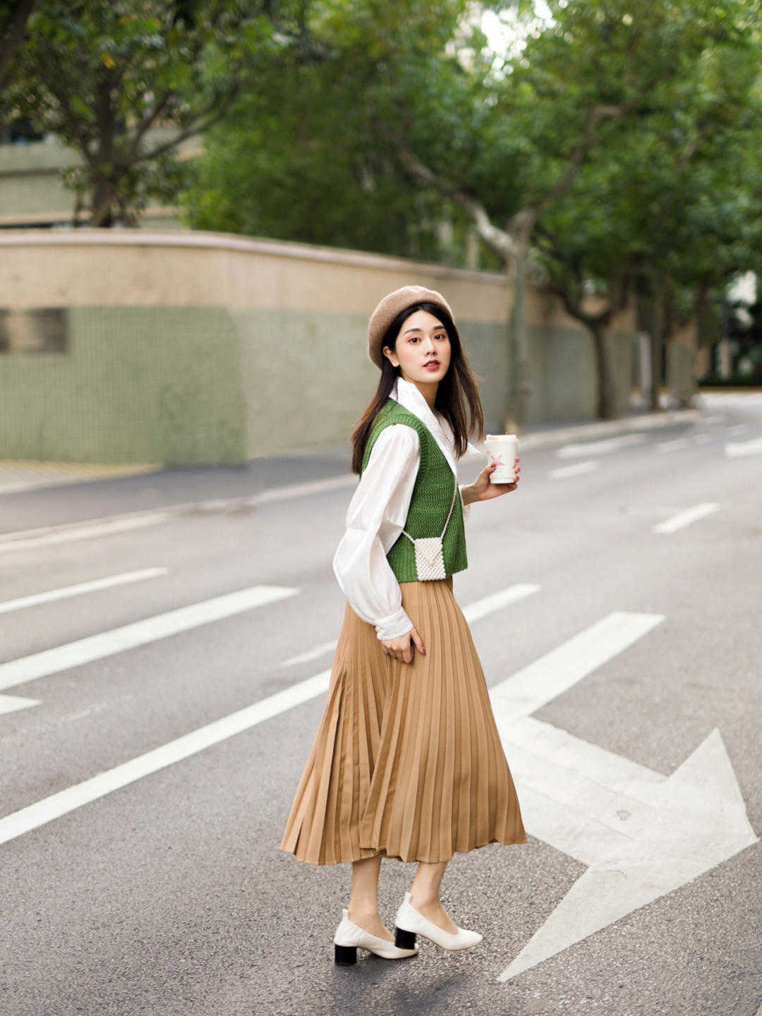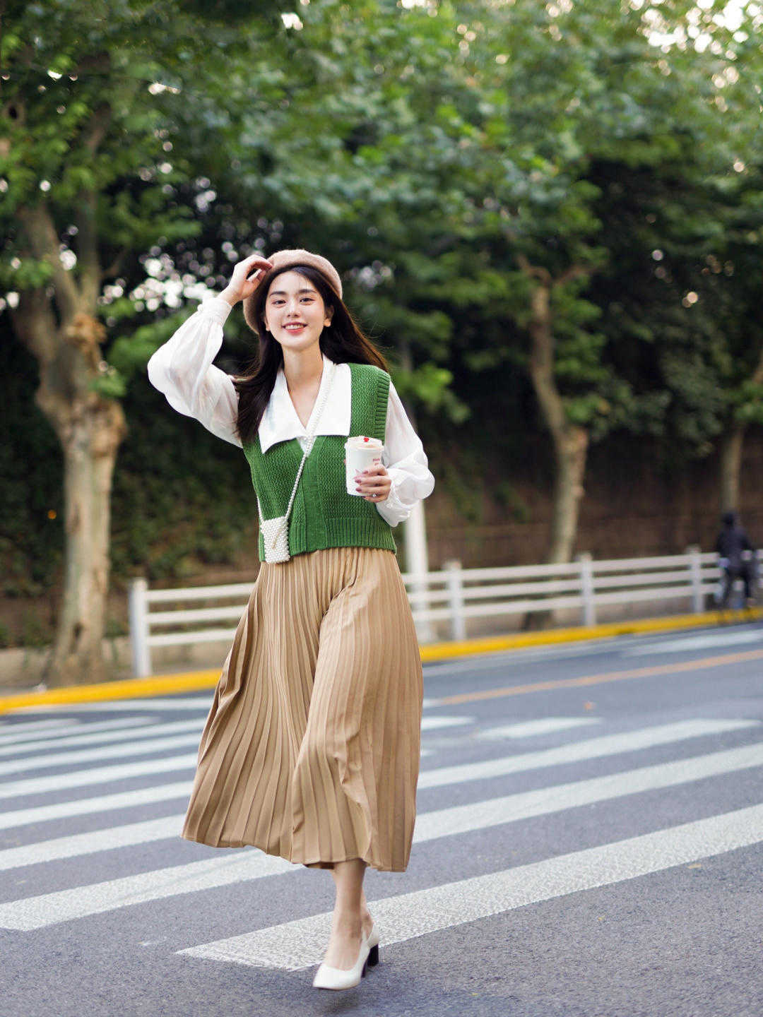 就像這位時尚博主一樣,選擇一款純白色的襯衫,其實也沒有任何太多的圖案,就感覺有一種簡簡單單的,但選擇一款綠色的馬甲來搭配,效果完全不一樣了,有一種春意盎然的感覺,綠色其實看起來有一種蓬蓽生輝,朝陽而生的感覺。
