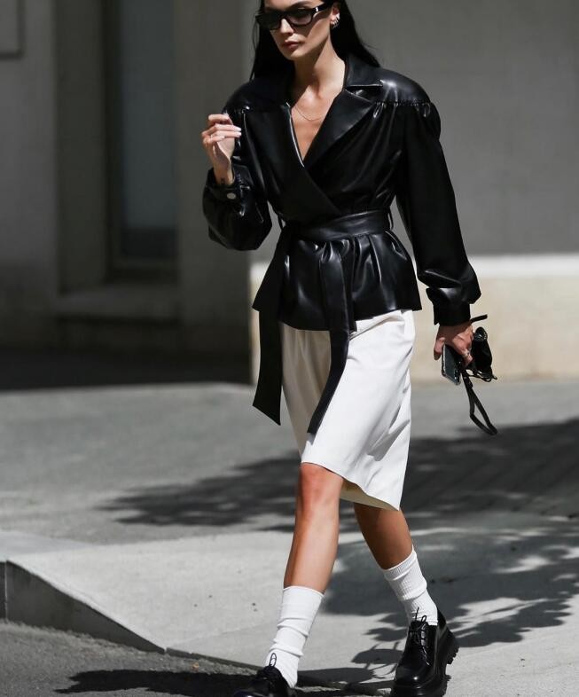 這款皮衣搭配不好會顯得邋遢,出鏡率不是很高,喜歡這款皮衣的女生,可以選擇搭配亮色的褲裝,白色褲子,與這款皮衣搭配起來都很有味道。