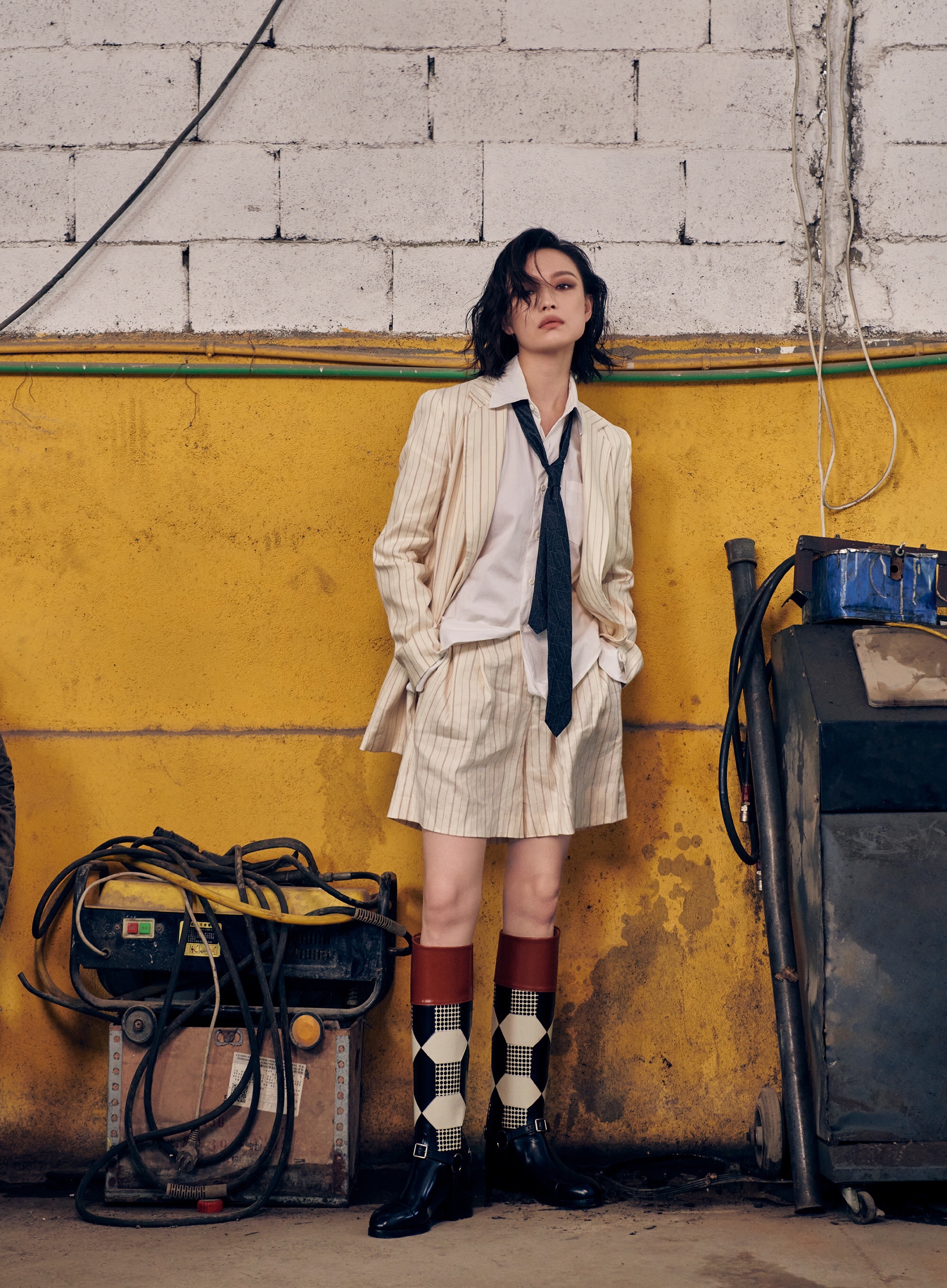 沒有人規定日常穿搭就是隨性慵懶,其實用西裝帶來一絲帥氣感更加有效,融入縱向條紋的遮臀西裝,有了基礎款襯衫的疊穿,瞬間打造中性風格,選擇一條五分短褲,對於整體比例感而言很有幫助,搭配中筒襪、直筒靴都是很不錯的。