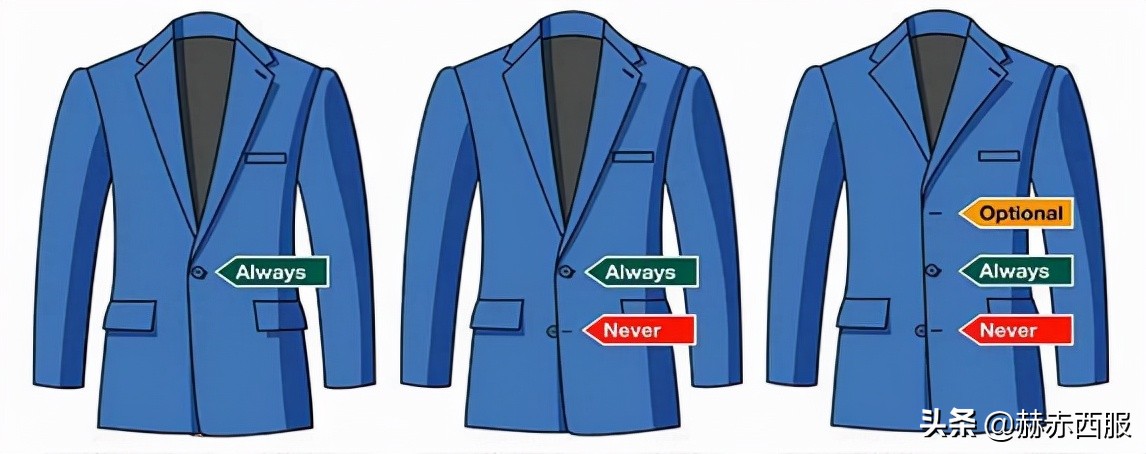 無論是幾顆鈕扣的外套,下方的最後一顆通常都不會扣上,因為會讓布料扭曲而產生皺褶,破壞整體身形的俐落線條