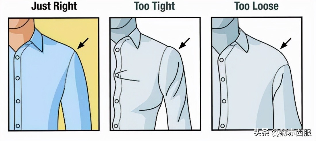 一件合身的西裝外套,肩膀處的縫線應落在肩膀外側,落在肩膀上或手臂處都不適合,而且不應有任何皺褶。