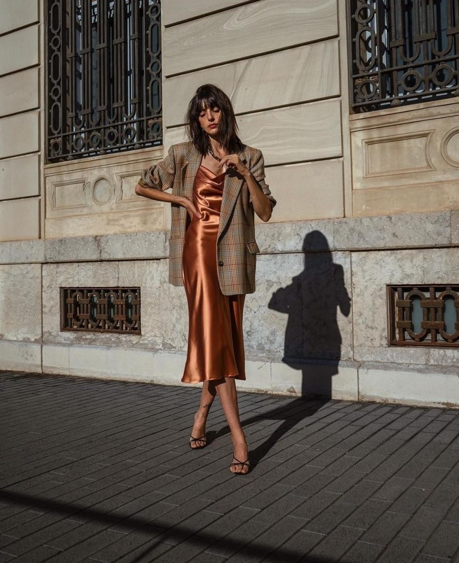 剛柔並濟的穿法有很多,西裝+連衣裙絕對是其中的佼佼者,一件Oversize的廓形西裝,冷靜的線條配合著寬闊的墊肩,將冷酷不羈的大女生風格盡情的展露,隱隱的橘色暗紋鑲嵌其中,倒是為整體增添了幾分英倫紳士的修養。內搭一件真絲緞面長裙,色澤真摯細膩、面料垂感有佳、渾然天成的貴氣在幹練的西裝中脫穎而出,這一份幹練與嫵媚並存的人間絕色,可稱得上是無與倫比的高級。