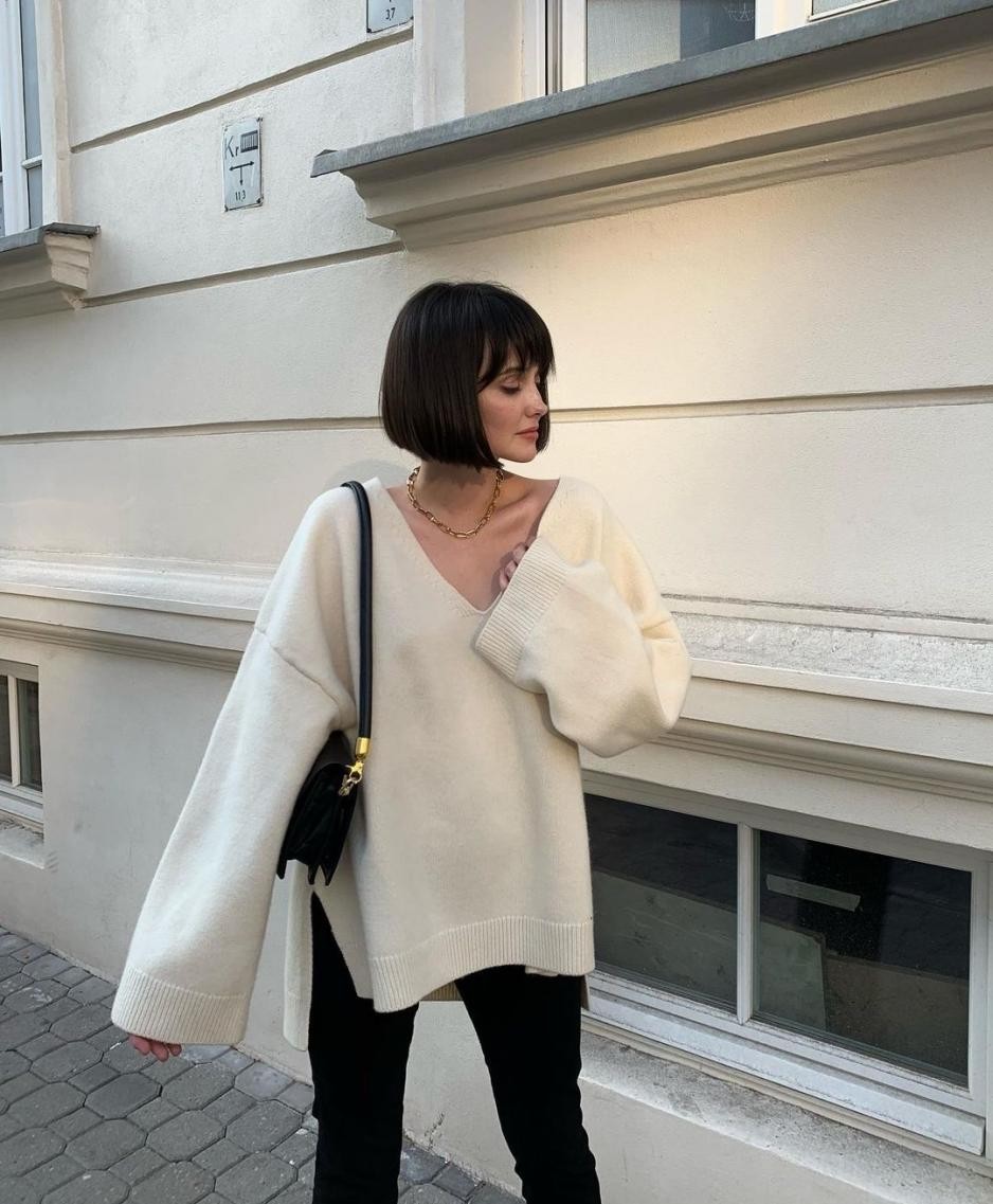 剛與柔的巧妙碰撞除了可以體現在服裝與服裝上,還能體現在服裝與配飾上。一件軟綿綿的V領毛衣,穿著者在松垮有度的版型間彰顯著慵懶優雅的自我,真是美如畫的場面。佩戴上硬朗四方的腋下包包,戴上金光閃閃的金色項鏈,強烈的風格對比更加突出時髦,輕豪華貴與素雅淡然的完美結合,誰看了能不心動?
