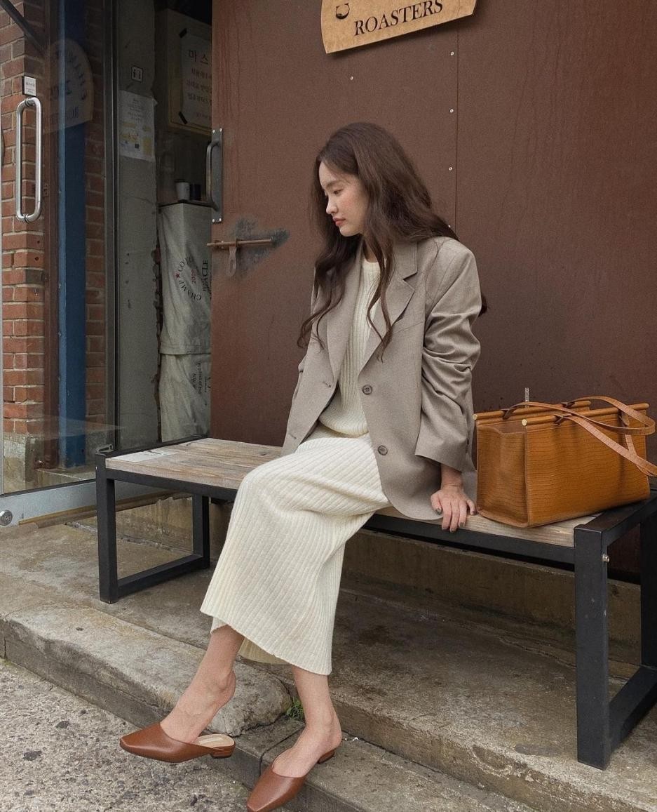 若你覺得緞面裙有點過於性感,不太適合具有親和力的自己。可以試試這種穿法,選擇一件淺褐色的西裝內搭一件米白色的針織裙,幹練大氣與溫婉賢淑不期而遇,要的就是這種溫婉和善的歐尼大姐姐風格。雖然針織和西裝的面料差異感不夠明顯,但是剛柔並存互相糅合的穿衣技巧是存在的,缺少了哪一件,都難以詮釋高級。