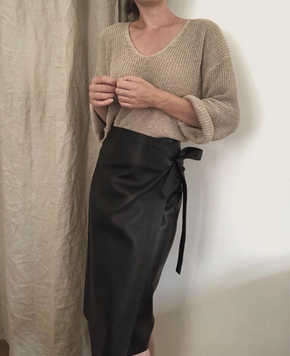 除了西裝+連衣裙的組合,針織衫+半裙的組合也是剛柔並濟組合的代表。一件大U領的套頭針織衫,針織紋路線的密度較大,比細膩針織多了幾分隨性慵懶之美。挑選這類針織時,面料的柔軟度和肌理感一定不能粗糙,否則上身就會特別顯廉價。下面配上一條啞光皮質的半裙,刻畫出盈盈一握的纖細腰肢,將柔情似水的女生味和堅韌瀟灑的大女子氣勢同時表達,美得不動聲色,美的素淨坦然。