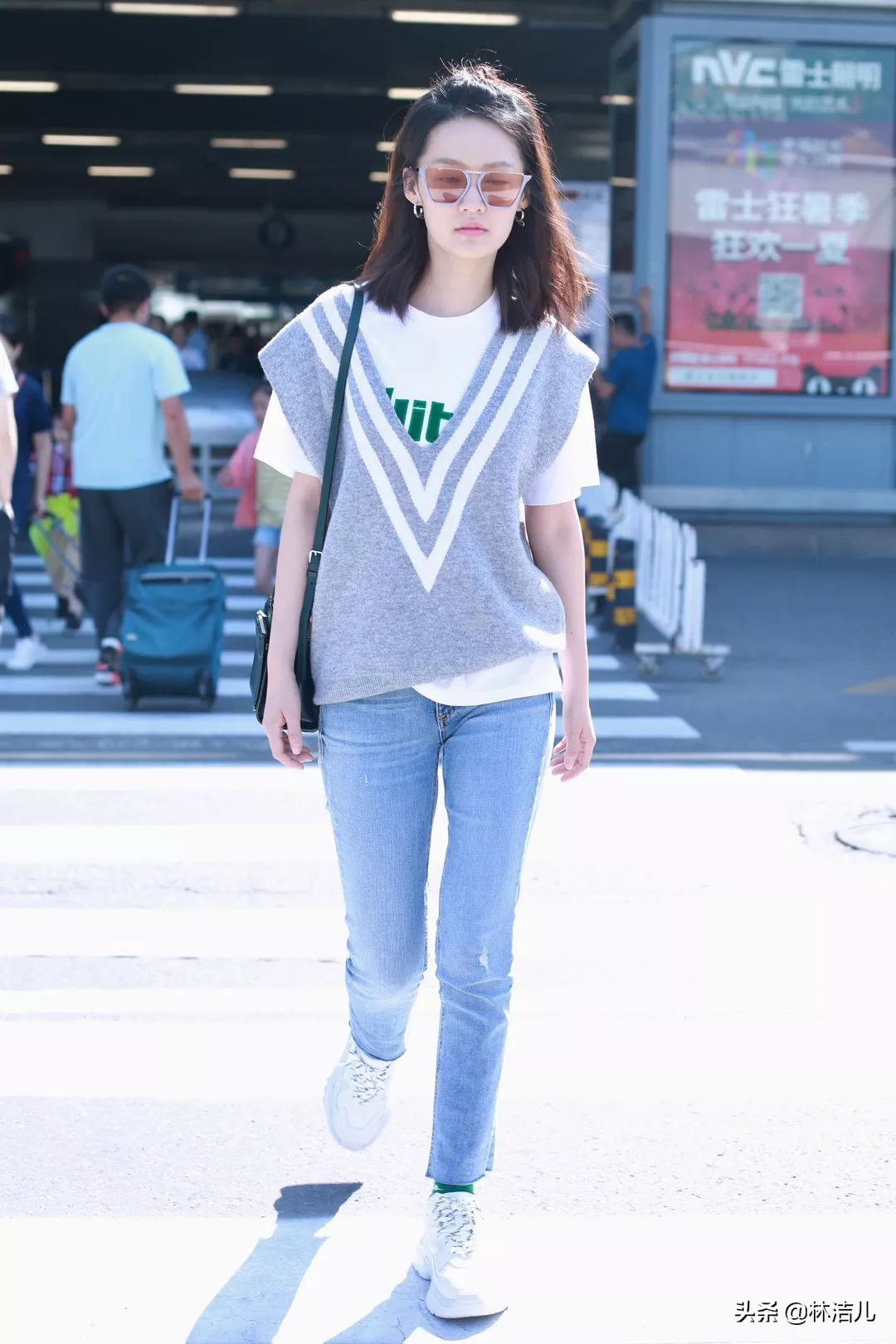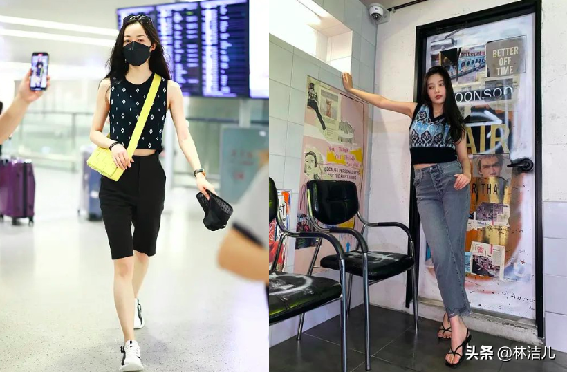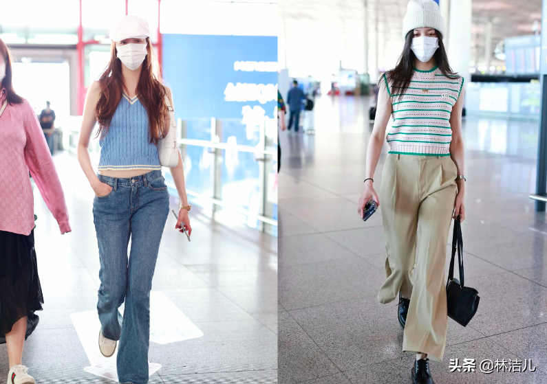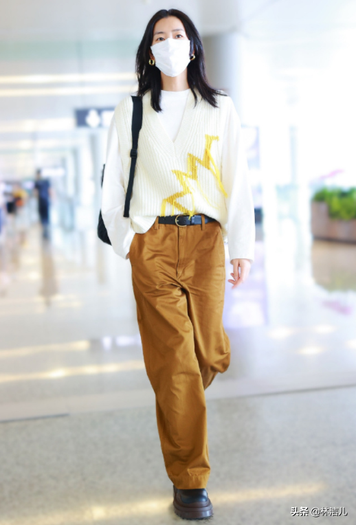 白襯衫和奶奶馬甲也是一組超棒的CP組合,寬大的白襯衫可以搭配稍微修身的馬甲or背心,這樣搭配會凸顯腰線,避免臃腫感。腿細的姐妹也可以選擇一件中長款的奶奶背心,再試試下半身失蹤的小技巧,秀出你的大長腿,看看曾可妮的機場街拍,甜酷感十足。