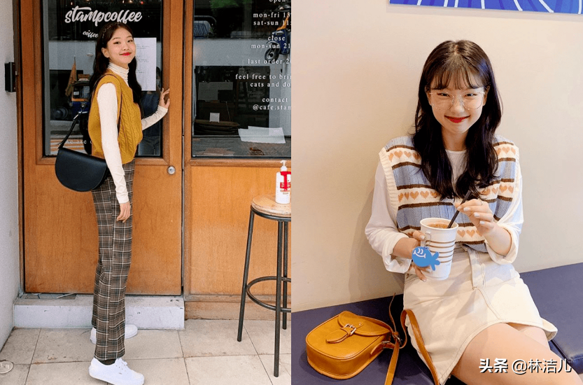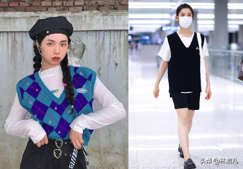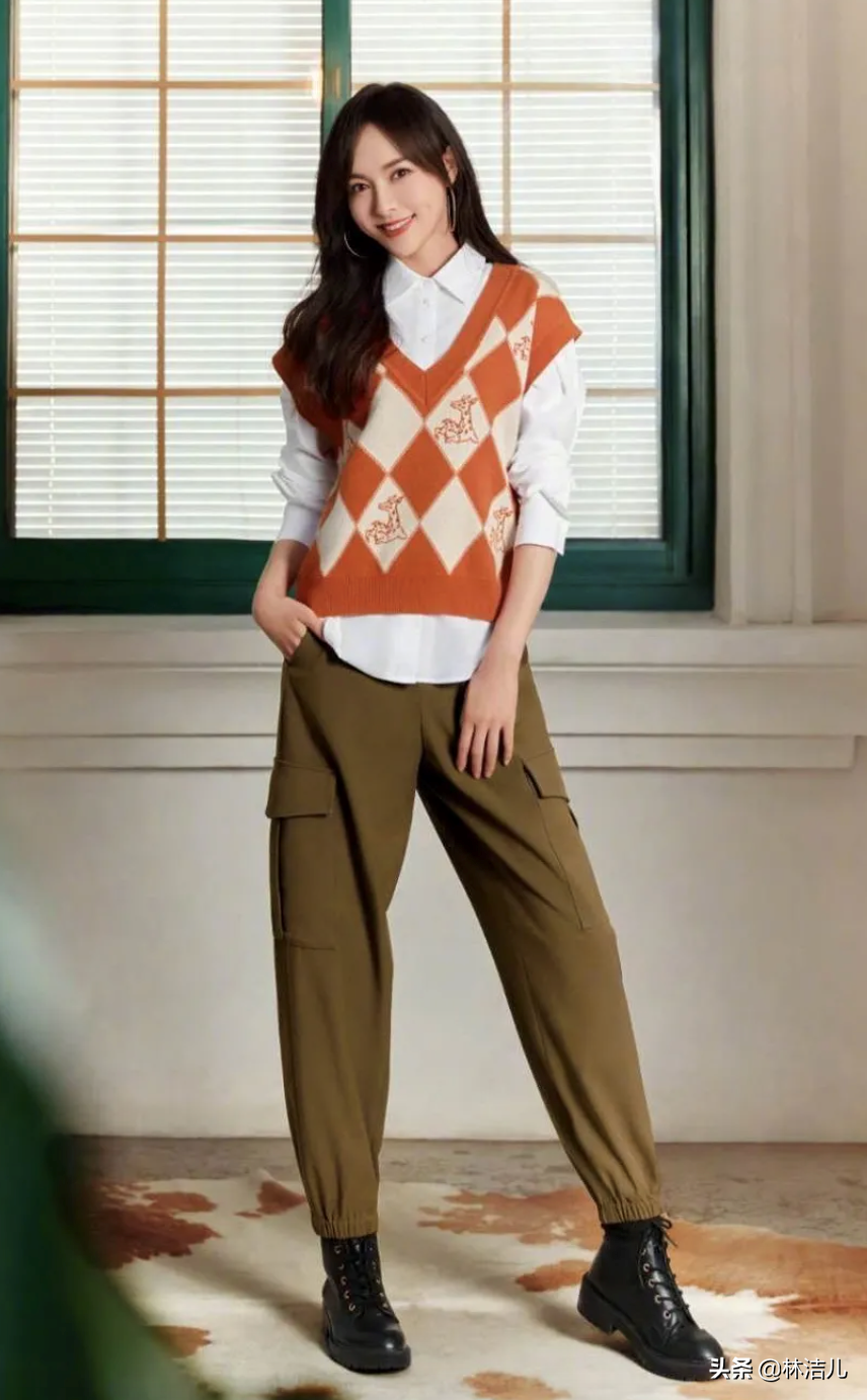 每年PANTONE都會制定出這一整年的流行色調,想要把奶奶背心穿出時尚感,緊跟當下的流行趨勢才是硬道理,例如今年火爆的活力黃以及牛油果綠,咱們都可以試試,顯白還減齡,喬欣用這兩個色調的針織馬甲與白T恤疊穿,溫柔甜美,不管是搭配絲絨英倫風短靴還是運動鞋,都顯得時尚又個性。