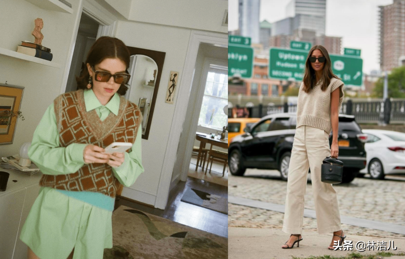 說到奶奶馬甲最時髦的穿法,大家一定要試試疊穿,簡單地搭配T恤或者襯衫都是時髦又不會出錯的選擇,保暖且顯瘦,輕薄的材質也不會在視覺上顯得臃腫。如果背心是純色款式,那麼內搭可以花哨一些,但是如果你選擇的奶奶馬甲本身就極具設計感,內搭就一定要選擇基礎純色款,才能在色調上保持協調。