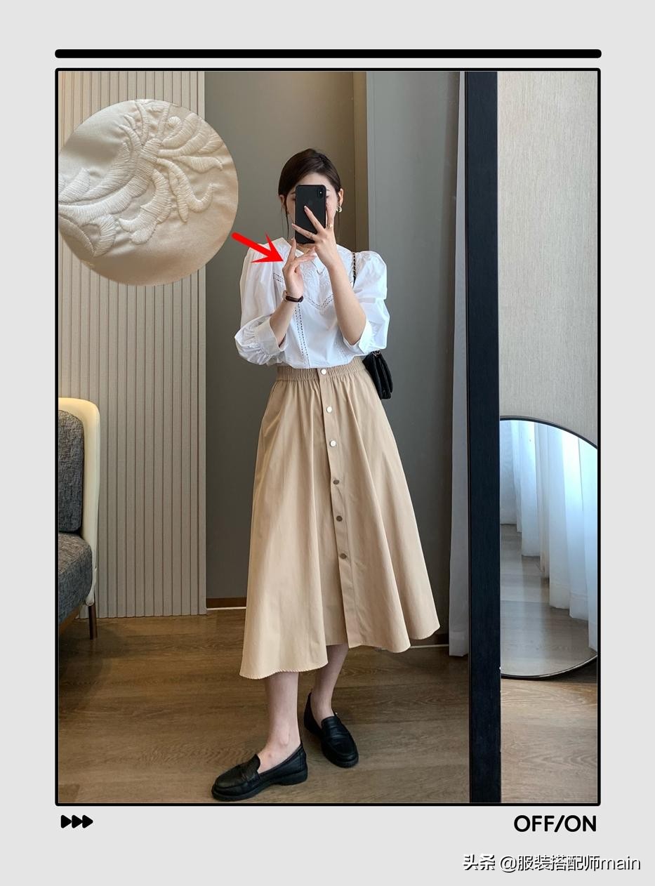 而且把襯衫衣擺塞進高腰的裙子裡,還超顯腿長的,對自己腿型不是很自信的女生,一定非常適用。