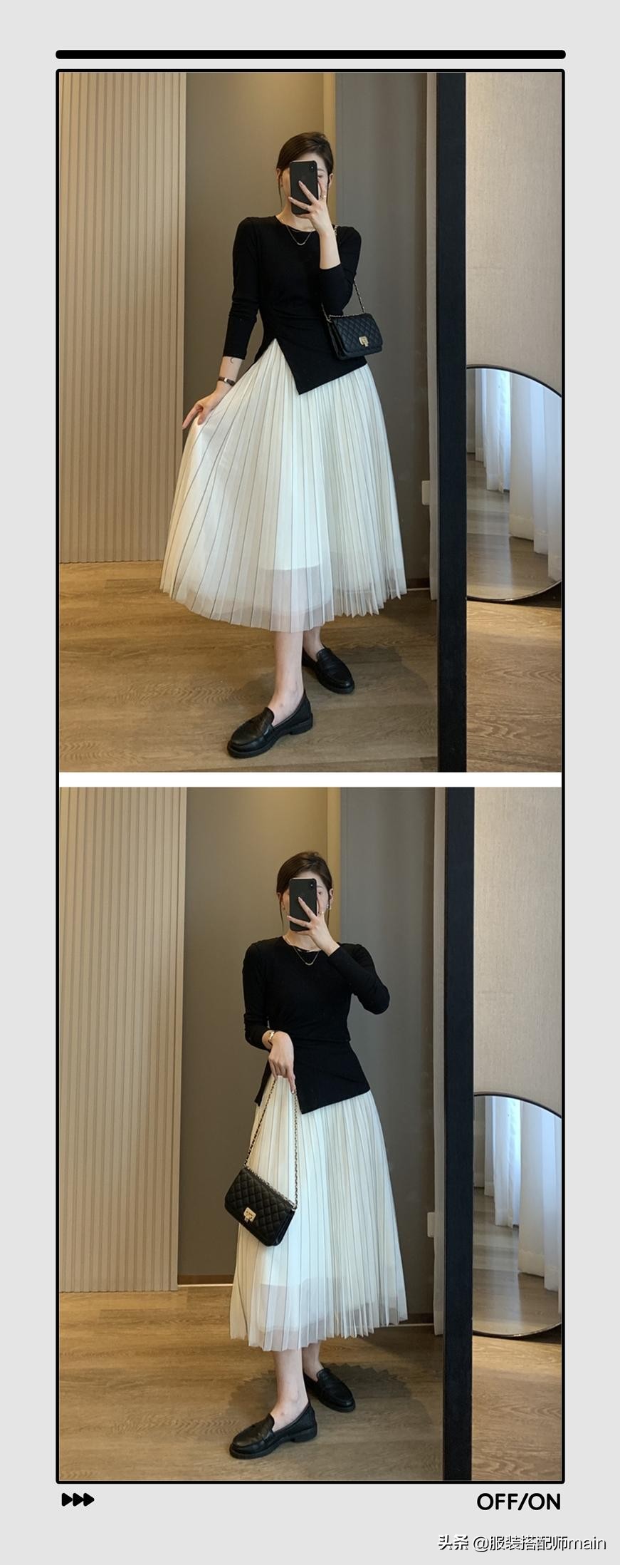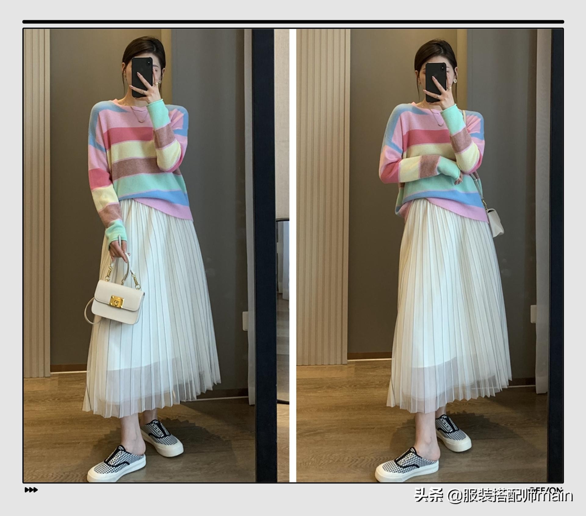 這條百褶紗裙我是很喜歡的,特別適合年輕女孩穿,日常搭一件彩色條紋毛衫,也是很青春活力的。