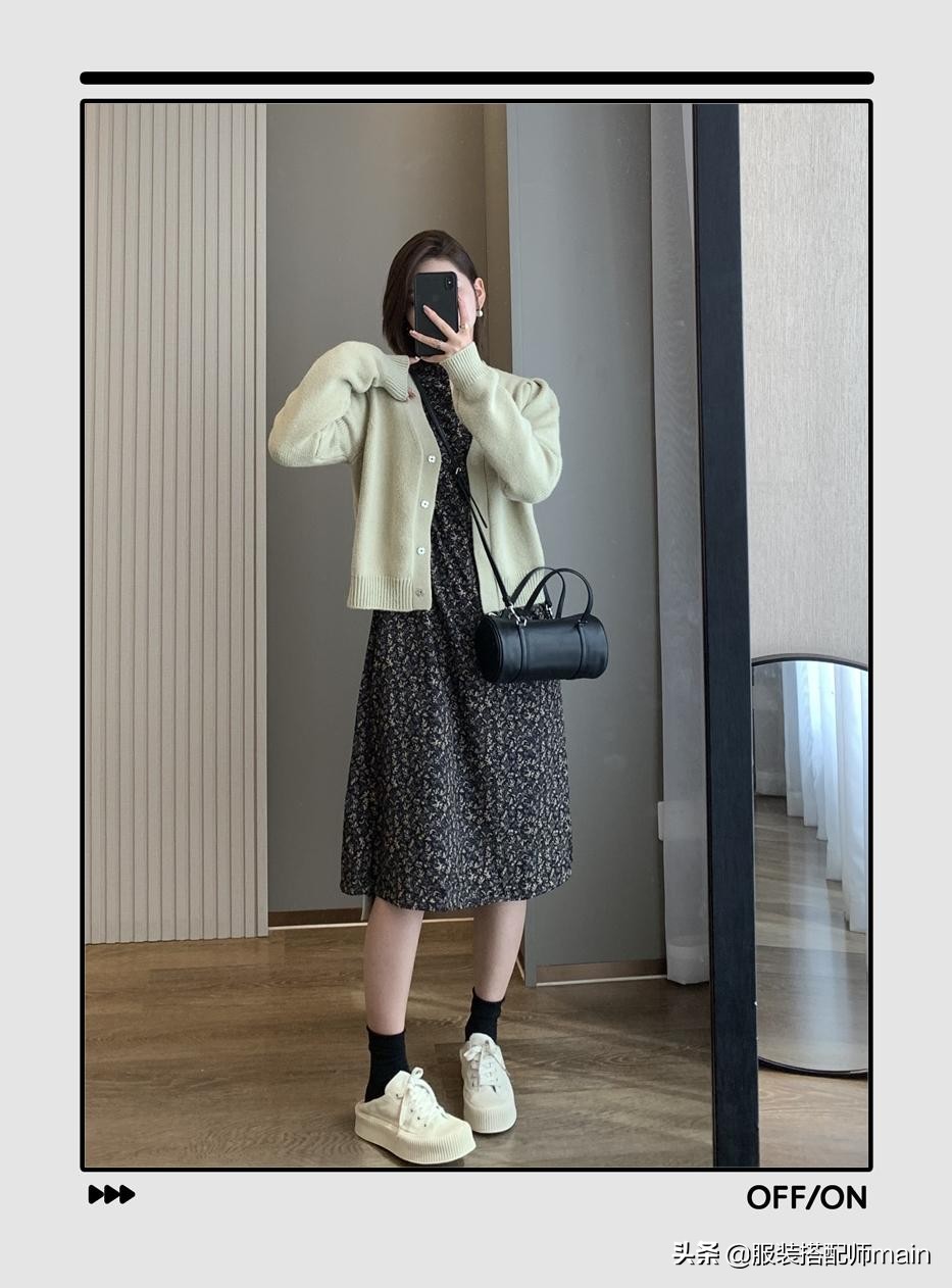 感覺冷的話可以帶一件針織開衫,配這條碎花裙最好是淺色的,很顯活力。腳上再穿上一雙帆布鞋,走再多的路也不會累了。