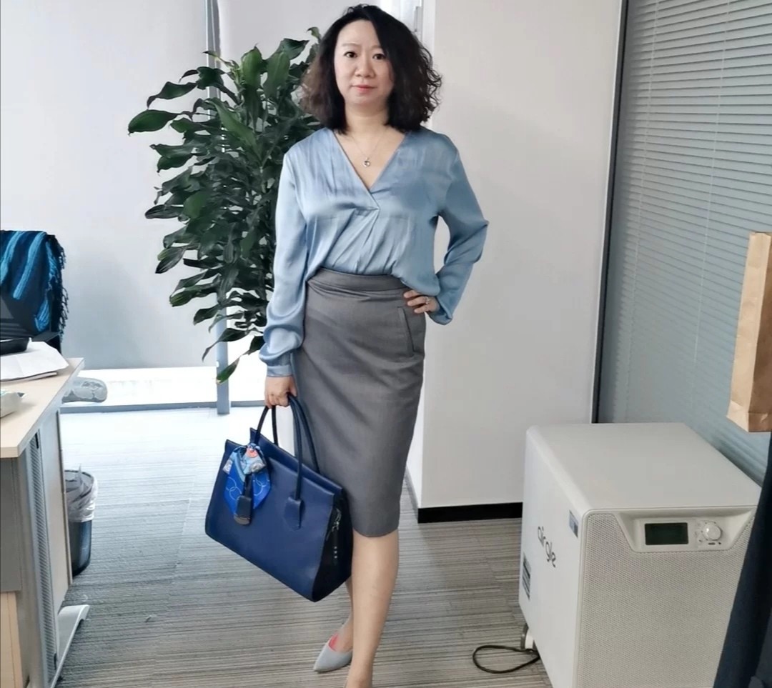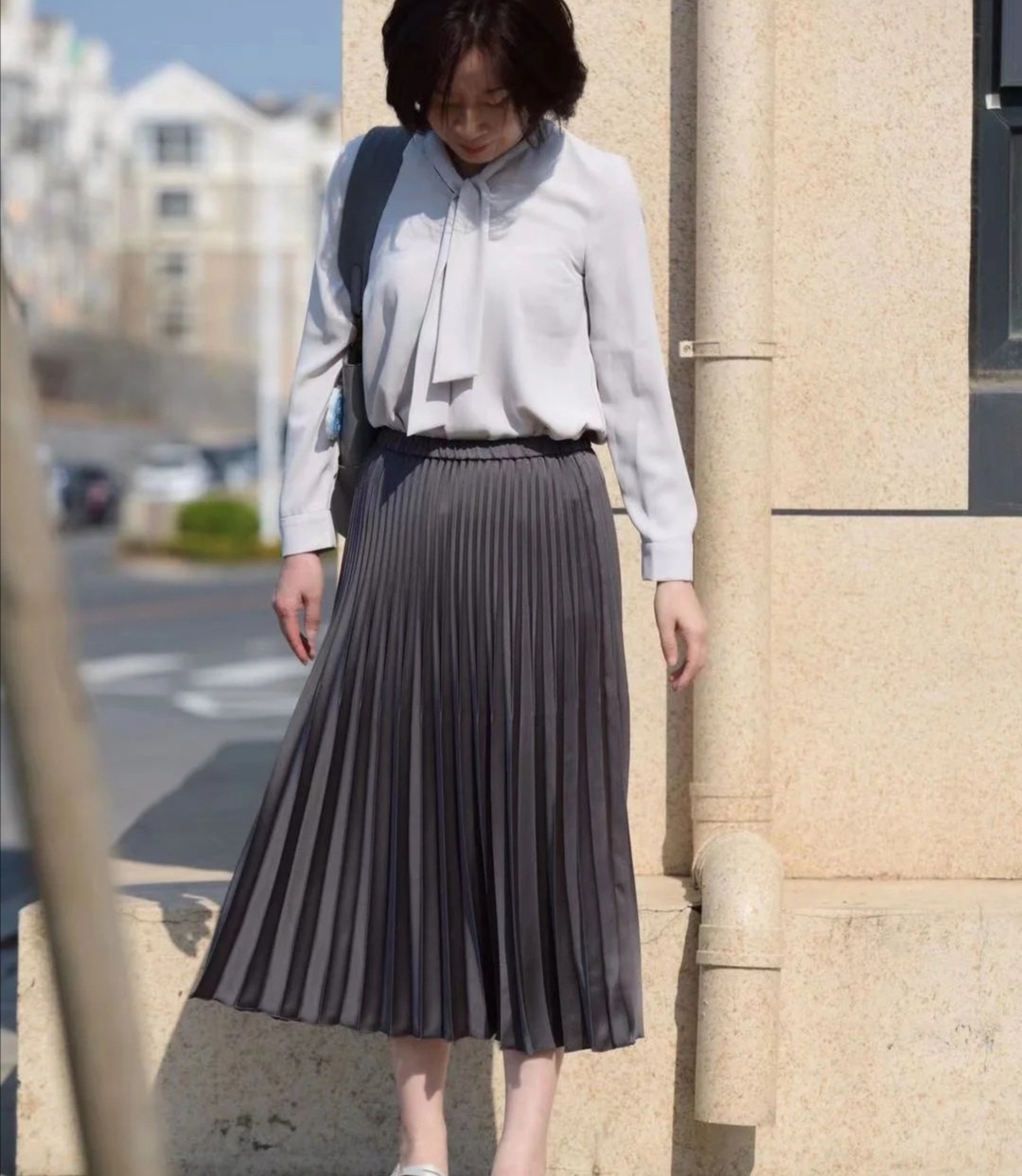 以這款灰色的裙子為例,它很適合創造出職業穿搭,是很有特色的樣式。把腰部的位置勾勒出來,線條明顯,也更加有女生味。