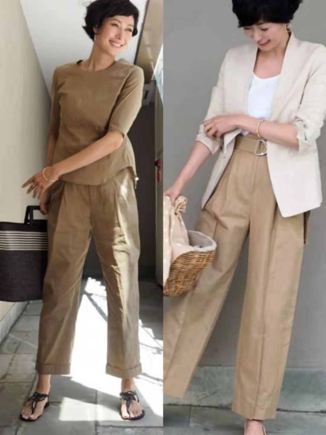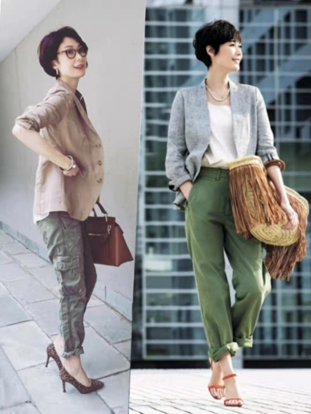 西裝是幹練利落的代名詞,如果用於日常穿搭,那麼建議中年女生選擇淺卡其色、淺灰色等款式,借助工裝褲來碰撞出時尚感,整體上休閒而減齡。