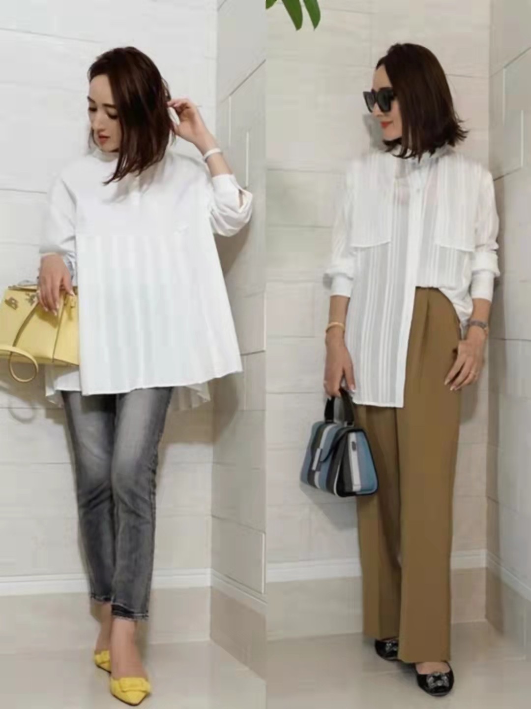 挑選白襯衫時,中年女生沒必要過於拘謹,選擇疊加小心機設計的款式,非但不會破壞掉這份簡約之美,還能提升俏皮感。