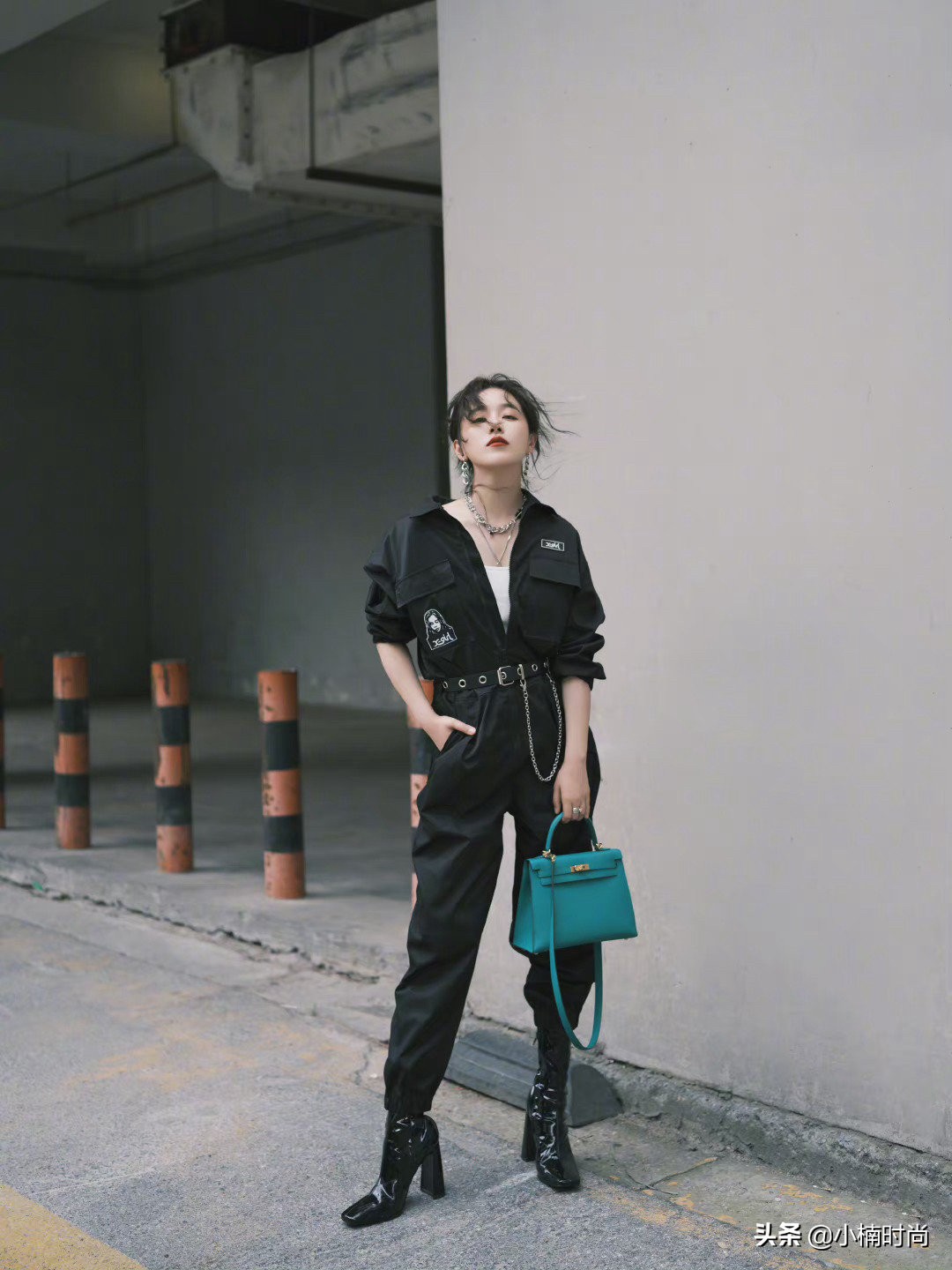 闞清子在最近的活動中穿了一身黑色連體工裝,收腰的結構顯得她身材很優越,紮起來的頭髮和身上的配飾也展示了她酷酷的性格,手上的綠色小皮包是唯一彩色點綴,整張照片都很吸睛。