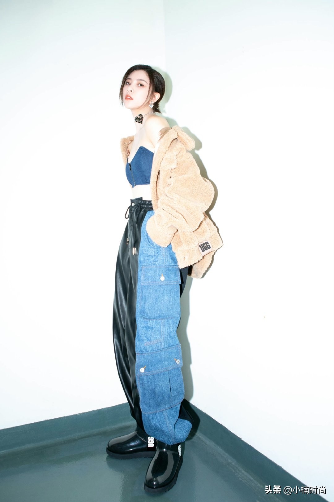 宋妍霏在出席活動時,下半身穿了一條拼接風的工裝褲,皮質和牛仔放在一起不顯違和,反而有一種濃濃的機械風,再搭配她上半身穿的簡單露臍裝,一下就襯出她高挑的身材和小細腰,十分符合她酷颯的個性。