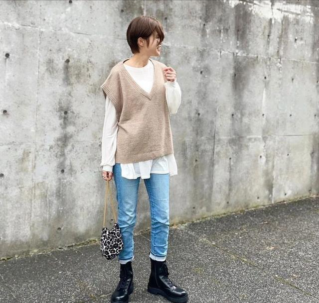 白色的襯衣作為打底,加上米色系的針織背心,搭配清新修身的牛仔褲,手裡面提著花紋的小提包,這一身基礎款,卻穿出了時尚之美,給人帶來眼前一亮的美感。