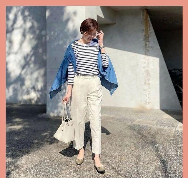 如圖這般搭配,清新減齡的牛仔外套,加上黑白橫條紋的襯衣,搭配白色的高腰長褲,穿出一身颯爽時尚。