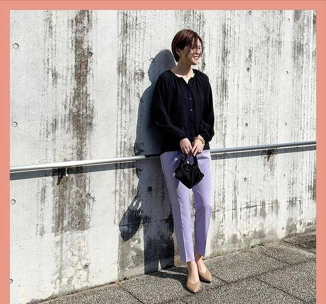 搭配比較清雅的淺紫色長褲,流暢的線條,襯托出好身材,簡單的基礎款,穿搭出時尚感。