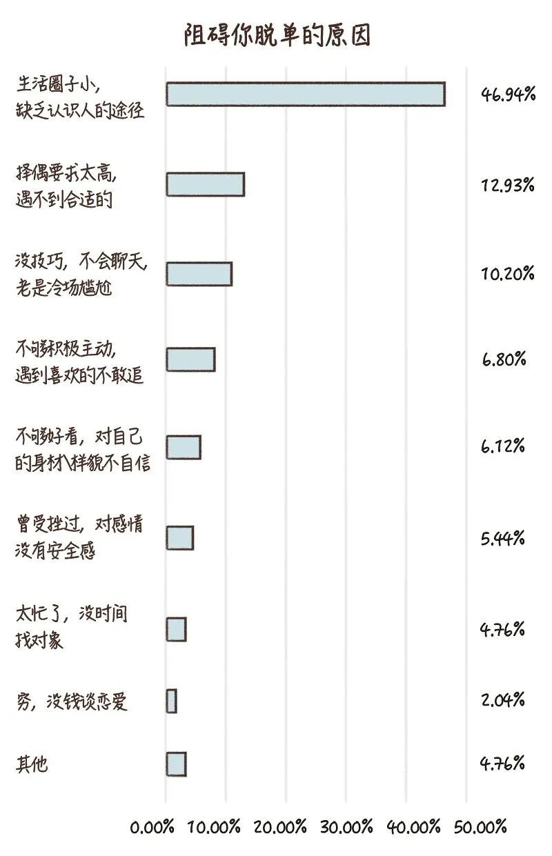 有46.94%的人認為,是 「生活圈子小,缺乏認識人的門路」這個原因阻礙了自己脫單。