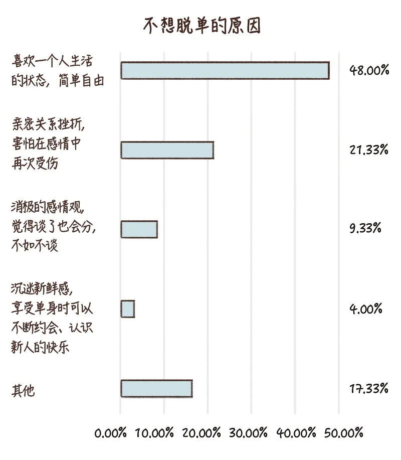 根據受訪者反饋,有超過三成的人(33.78%)其實是主動單身。我們進一步挖掘了他們不想脫單的原因,發現被pick最多的選項是「喜歡一個人生活的狀態,簡單自由(48.00%)」