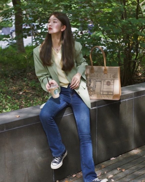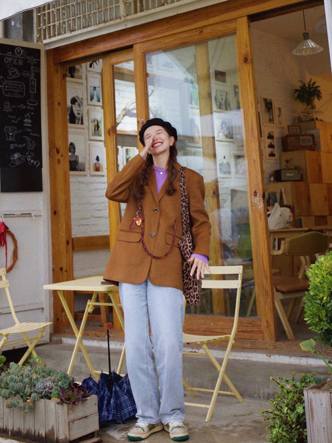在選擇西裝的時候,我們要注意內搭的色彩和西裝最好有所呼應,下面的綠色西裝搭配鵝黃色內搭,這種清新的色彩結合起來便會營造出溫柔和浪漫的魅力,下半身的深藍色牛仔褲也很寬鬆,版型寬鬆的褲裝對於身材的修飾效果會很不錯,微胖身材的姐妹可以嘗試。