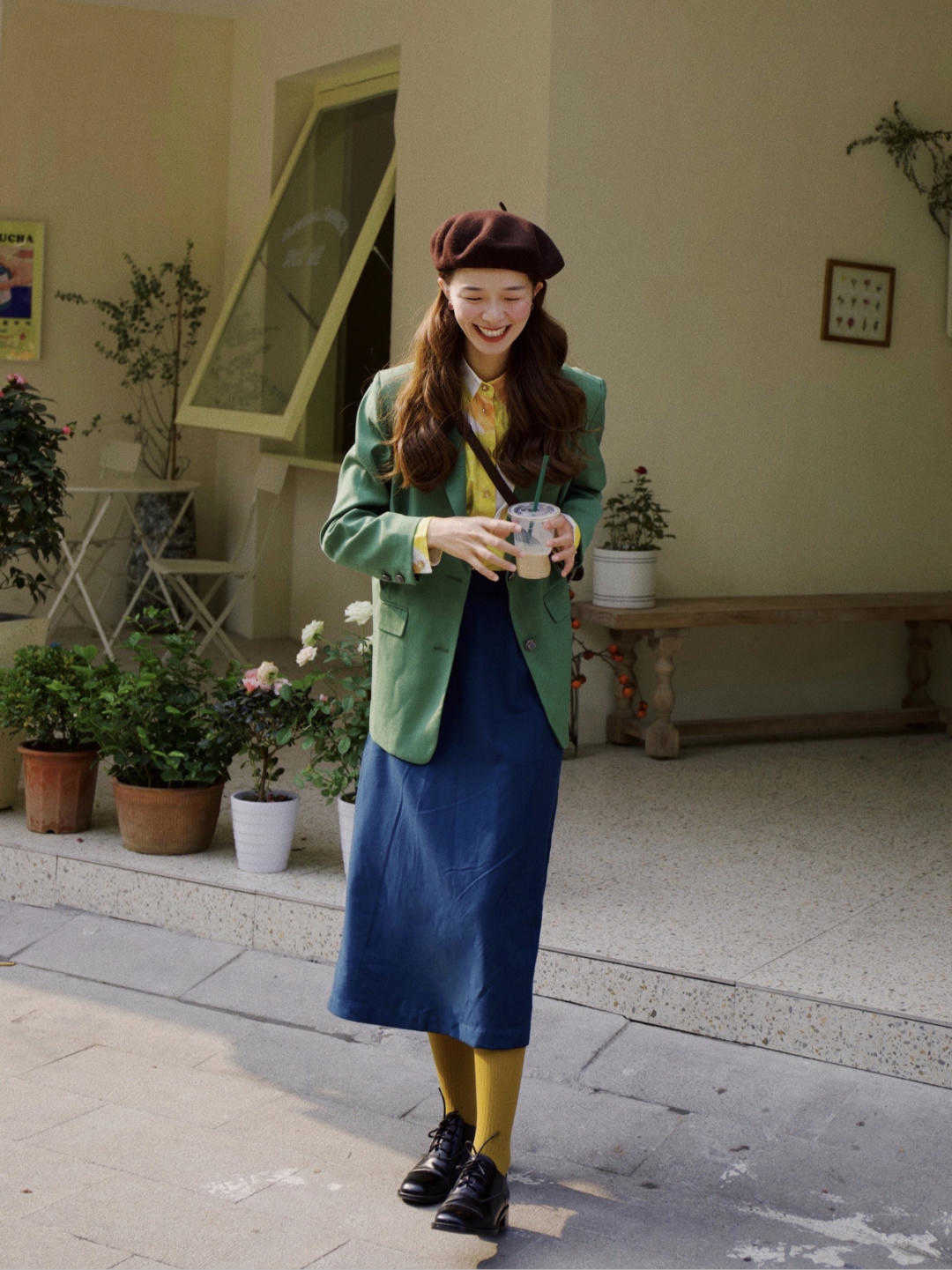 下面這一種綠色的針織衫搭配了黃色針織半身裙,利用上下混色的技巧來幫助我們分割了整個人的比例,這一種淺色系的穿搭也特別適合秋冬季節,能夠讓你看上去更有活力,充滿著生機。