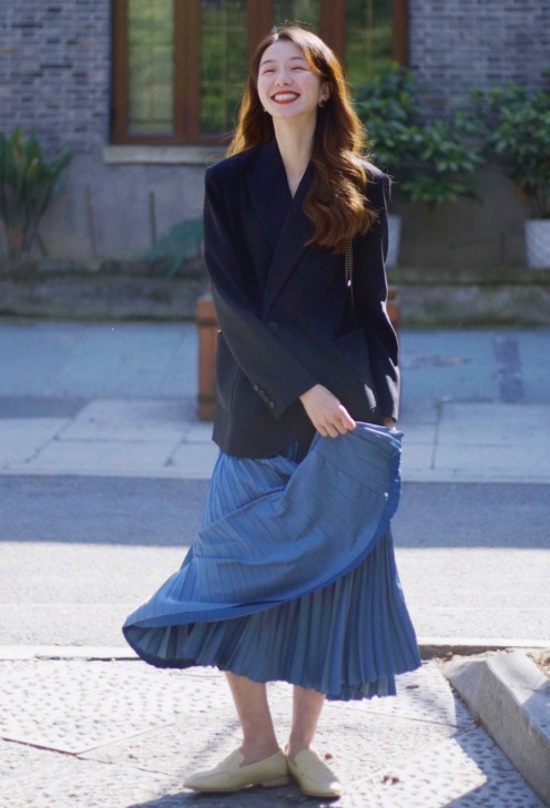 黑色西裝相信大家都嘗試過吧,這種最經典的純色西裝在日常生活中的出鏡率很高,如果你覺得有些單調,下半身可以去搭配亮色系的裙裝。既能夠提升女生味,又能夠打破黑色西裝的單調感。