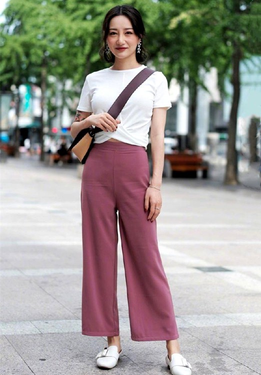 其實關於這個問題,也是可以採用一種下松上緊的穿搭法,這樣一來的話,不僅能夠凸顯出身材來,而且還可以把胯寬的缺點遮住了。例如女生在挑選上裝的時候,可以選用一件修身白色T恤,然後下身搭配粉色闊腿褲,這樣看起來十分優雅又大方。