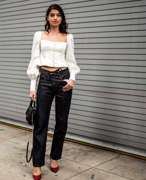 不過這裡建議可以選用方形領設計的上裝了,因為這類設計可以有弱化肩寬的效果,並且還能夠顯露出迷人的鎖骨,也是十分潮流又吸睛了。像女生可以選擇一件白色方領設計的上衣,然後搭配黑色褲裝,整體看上去即乾淨,又很文雅。