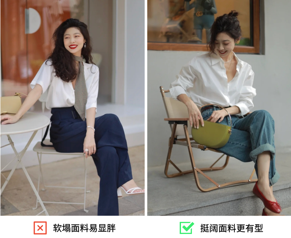 硬面料如棉、亞麻、牛仔等,一般挺括有型,比較遮肉、修飾身材;