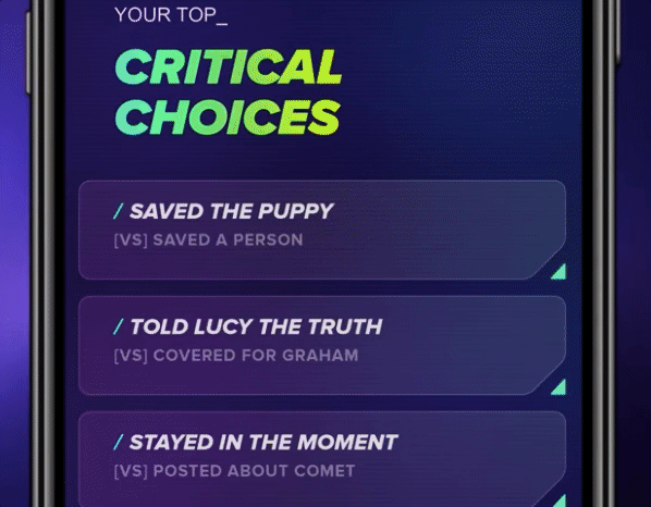 第一季 Swipe Night 在 2019 年 10 月開啟,當時的劇情設定是世界末日:3 小時後地球就要毀滅了,眼前一系列緊急情況,你如何選擇?要帶食物還是急救箱?要向陌生人伸出援手嗎?朋友心愛的小狗要跑丟了,你要救它嗎?你可以通過左右滑卡做出選擇,跟 Netflix 的 《黑鏡:潘達斯奈基》一樣,不同的選擇將導向不同的劇情發展。