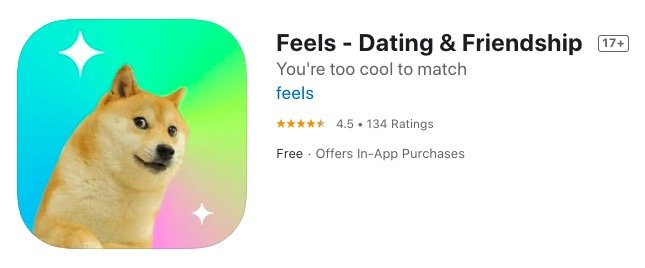 Feels 不將自己定位為約會 App,它認為「滑卡無聊」「匹配無趣」,希望聚集一群酷酷的人放開創意和想像力一起玩。Feels 在 App Store 上的圖標是一個賤嗖嗖的狗頭;它的廣告片畫風也相當好玩,讓人看完忍不住跟著搖頭晃腦喊一句「深井冰啊!」