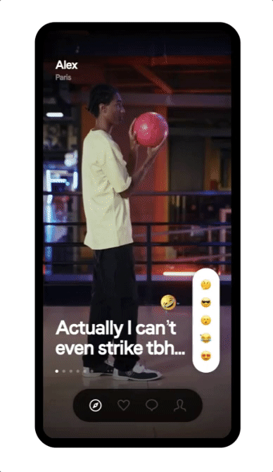 設置個人檔案時,你可以上傳視訊和照片,也可以加入一些展示個性的問答,所有畫面都可以二次創作添加文案和表情包。刷刷刷的時候,隨時點擊右下方的 emoji,就可以向對方發送你的感受。