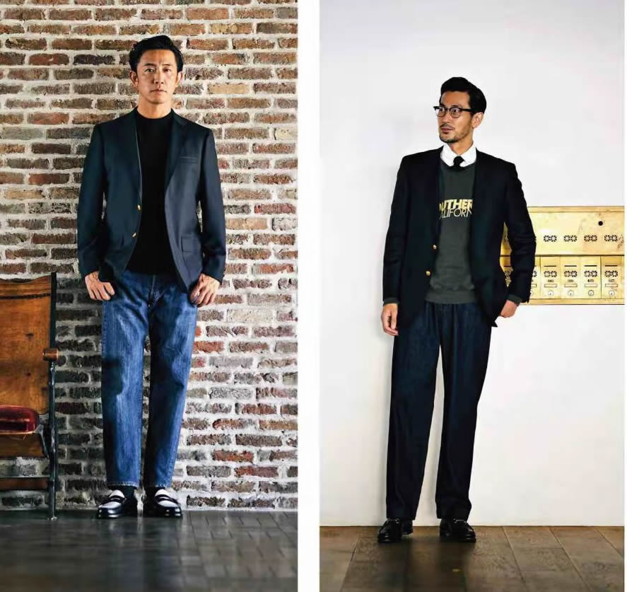 如今的它,豐富多彩,從深藍演變到深灰色、黑色不一而足,而風格也更加撲朔迷離。可休閒、可正式,就看如何去組合了。