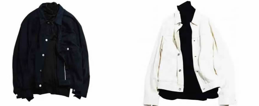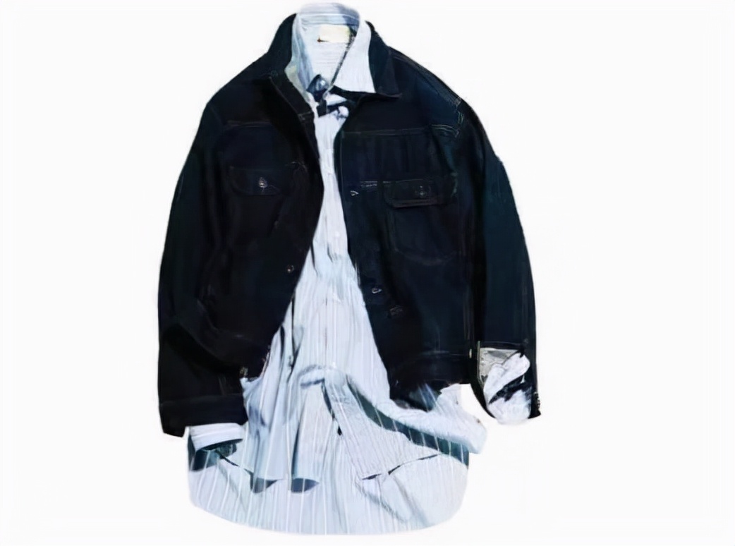 要點:翻領襯衫與牛仔衣的翻領同時出現,可能會有些小尷尬,處理好它們的關係,是好看的細節要點。盡量讓襯衫翻領立起,牛仔領往下折。