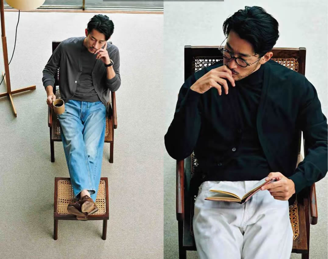 在輕薄的基礎上,放任針織的粗糙,就會演變成休閒風當道的休閒開衫。材質的不同,決定著風格的細微差異。