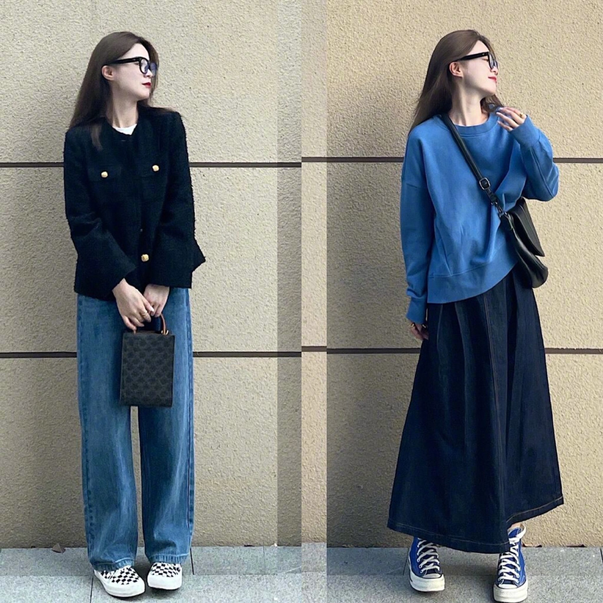 黑色小外套+藍色闊腿褲。這套搭配的亮點在風格的混搭上,你以為博主要表達正式幹練感,卻因為闊腿牛仔褲的搭配,顯得更加有活力,更有休閒感,這種搭配比起外套搭配西褲的方式更加減齡,有活力。
