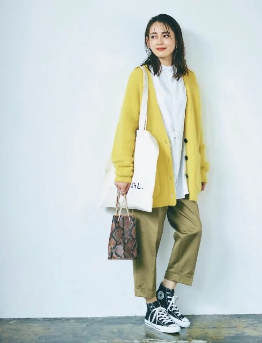 灰色衛衣+藍色闊腿褲。這一套就是充滿運動休閒感的穿搭。這一套高級洋氣的點在哪裡呢?鞋子的搭配很出彩。灰色、藍色在視覺上形成相近色,有種水到渠成的感覺,但是要說亮點話的,還是缺少了一點什麼。巧妙在搭配了一雙亮黃色的帆布鞋,一下子就將整體穿搭點亮了,休閒感十足又不乏時尚感。