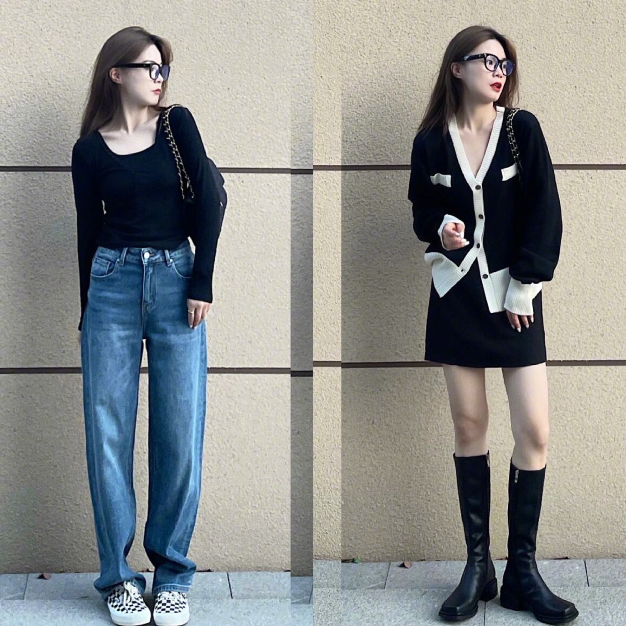 黑色小外套+藍色闊腿褲。這套搭配的亮點在風格的混搭上,你以為博主要表達正式幹練感,卻因為闊腿牛仔褲的搭配,顯得更加有活力,更有休閒感,這種搭配比起外套搭配西褲的方式更加減齡,有活力。