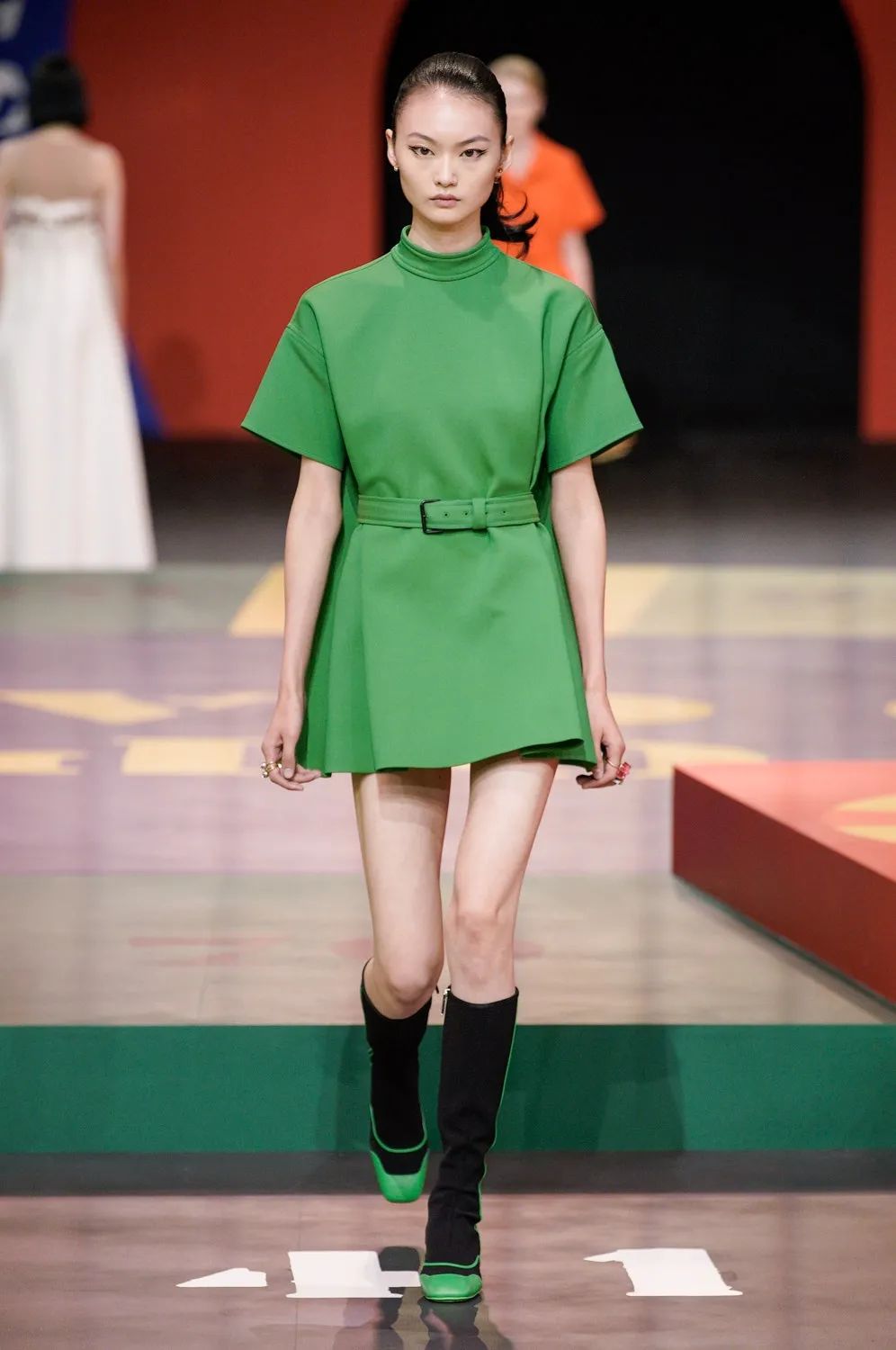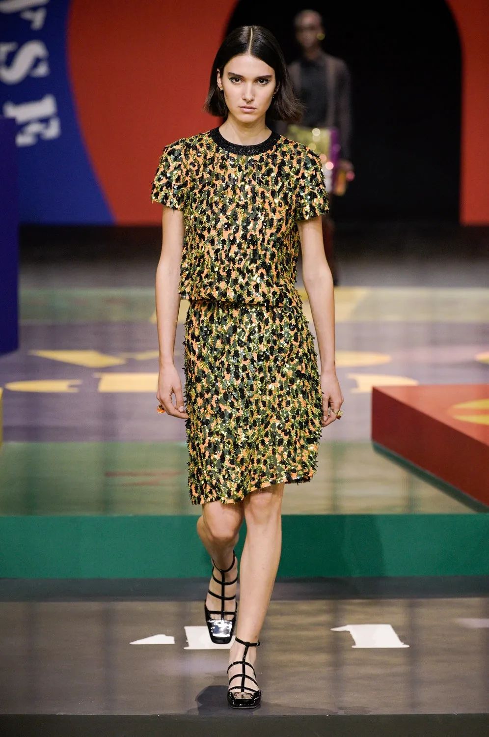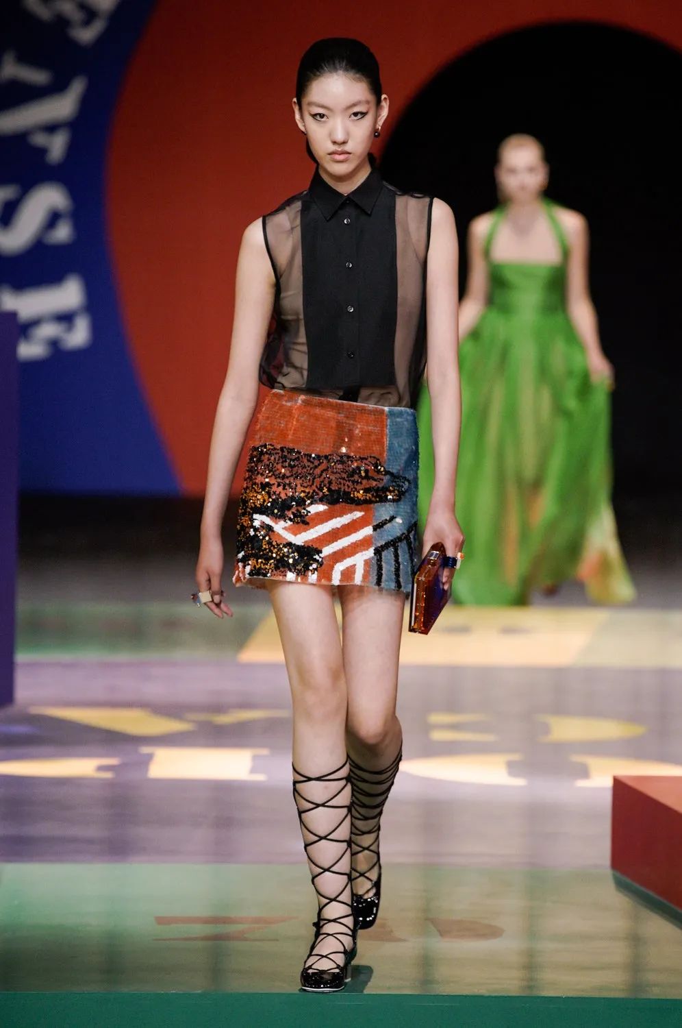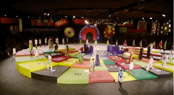 北京時間9月28日21:00,黑暗的秀場被鎂光燈從四面八方打亮,85名模特在由各種糖果色塊拼接的圓上早已定位,音樂響起,讓我們開啟這場輪盤遊戲。