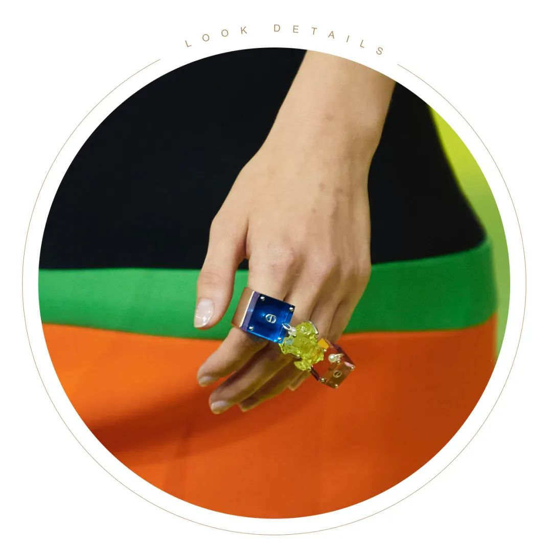 這時正在跳搖擺舞的女郎穿著黑白短裙,總覺得指尖缺少一點色彩,來呼應此時五光十色的舞廳,於是她們戴上了亞克力戒指,放肆地疊搭讓指尖的色彩跳躍起來,與舞廳的燈光反射出更耀眼的光芒。