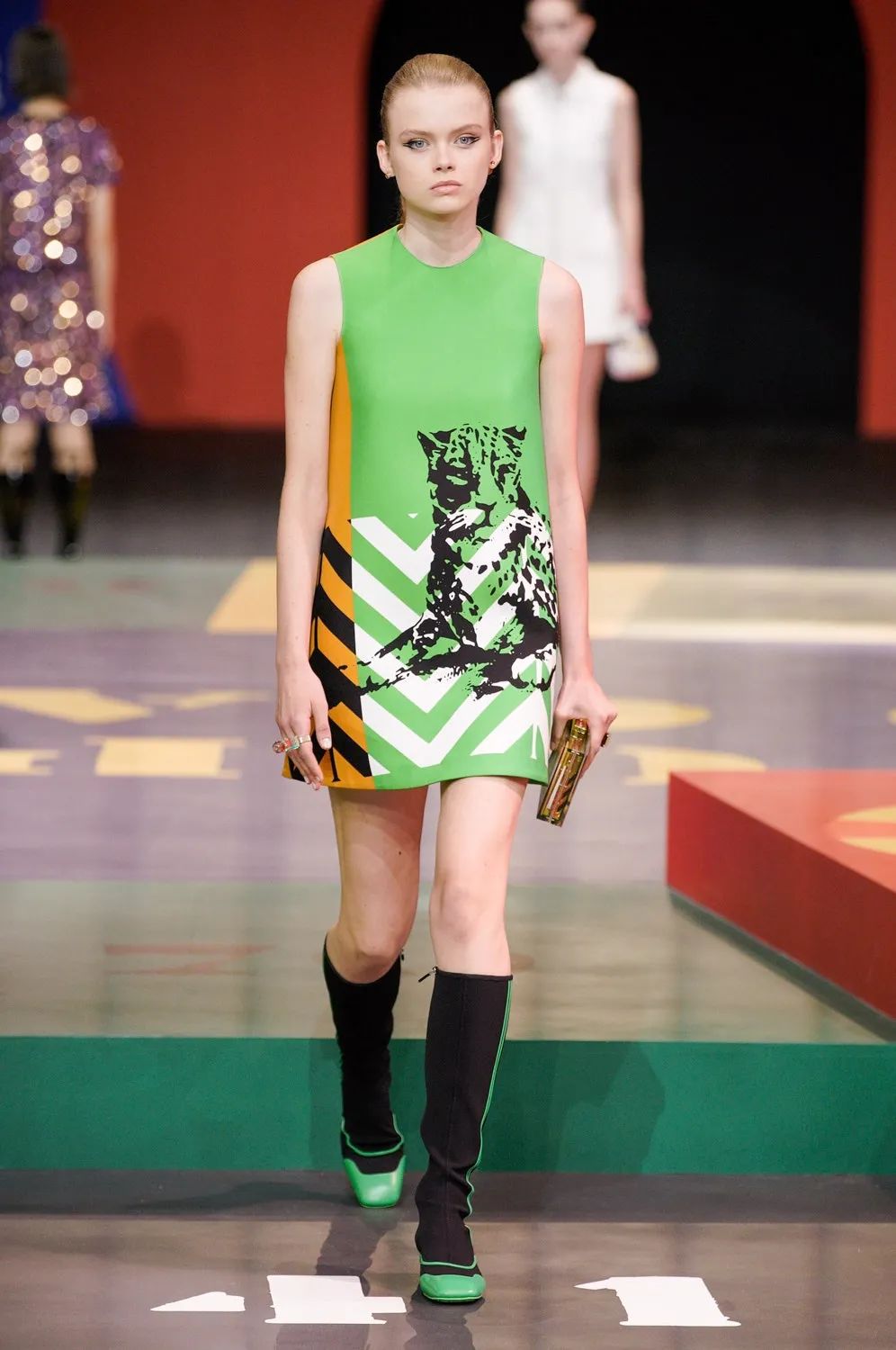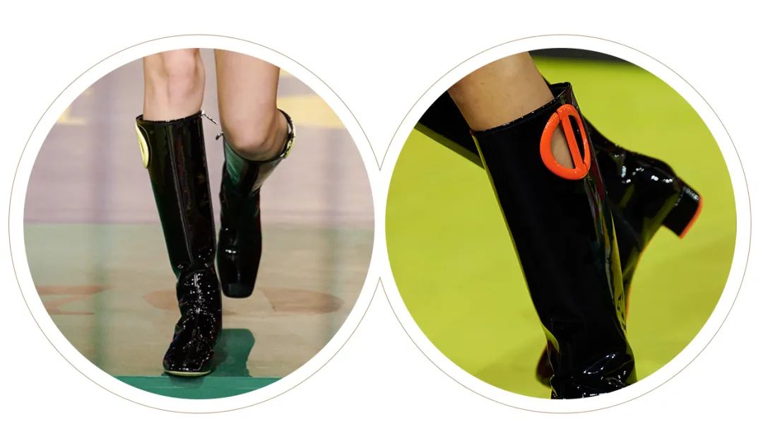秀場上幾雙與迷你短裙搭配的靴子,似乎擁有成為Dior這季鞋履爆款的資本。這種名叫搖擺靴 (Go-go Boots)的靴型起源於60年代中期,是當時跳搖擺舞時所穿的靴子,與經典的迷你短裙搭配,就是當時最時髦的穿搭。