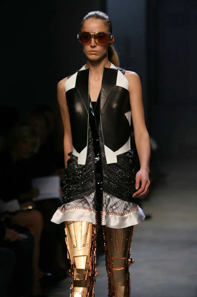 從1999年的世紀末彷徨,到邁入千禧年的雀躍激昂,60年代人類登上月球的高漲情緒在這個時代的開端又一次重現。在許多上世紀科幻電影的描繪裡,此時此刻,宇宙應該已經是一個司空見慣的地界,人們甚至可以來去自如地展開各種太空漫遊。而事實雖不如此,我們對遙遠的宇宙仍然所知甚少,但日新月異的技術發展使人感覺不論與太空還是與未來的距離確實在縮短。這也逐漸成為時裝設計的常規命題作文,屢屢有設計師交上高分答卷。Nicolas Ghesquière,從入主Balenciaga到執掌Louis Vuitton,科幻是永恒的主題。Balenciaga和60年代太空時代的淵源匪淺,André Courrèges曾師從Cristóbal Balenciaga,而Paco Rabanne的母親則曾是Balenciaga的裁縫。因此,典型的太空時裝中對於服裝結構及面料肌理的塑造上都不乏Balenciaga的影響。而這種影響是相互交融的,在Balenciaga 2007春夏系列中,處處可見太空時代的影子:線條凌厲的肩部廓形、金屬鏈條密布的迷你裙、盔甲般的無袖馬甲……一向熱衷於從科幻電影中汲取靈感的Ghesquière,此次站在過去與未來的交界處,勾勒出了當代女戰士的颯爽英姿。