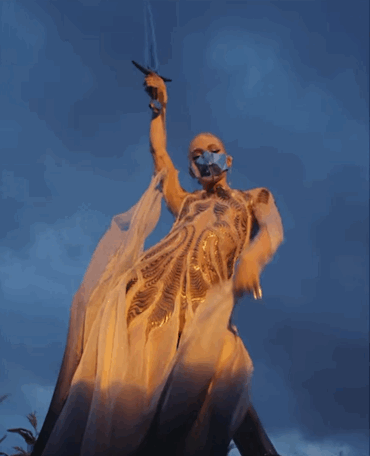 今年,被稱為「時尚圈奧斯卡」的met gala紅毯上,最令人印象深刻的有兩個造型。來自女歌手Grimes,一身Iris van Herpen極具未來感的禮服搭配銀色金屬感口罩,再加上手持長劍與寶典,像是直接從科幻作品《沙丘》走出來的角色。